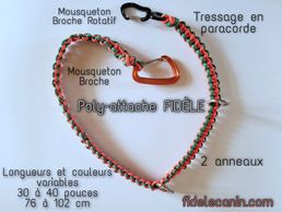La poly-attache est une attache très polyvalente: elle permet de faire une laisse plus ou moins longue grâce à ses 2 anneaux fixes, une attache sur une objet, (comme dans la voiture, sur une clôture) une rallonge ajoutée à une ceinture à la taille, une rallonge ajoutée au bout d'une multi-laisse. Elle est faite de tressage paracorde, hyper solide (près de 1000 livres de résistance), elle comprend un mousqueton broche (12,000 livres de résistance), un mousqueton broche rotatif (1000 livres de résistance) (donc l'attache ne peut se tortiller) et 2 anneaux soudés et fixes. Grâce à ses 2 anneaux fixes vous pouvez ajuster la longueur de l'attache selon vos besoins et selon les situations.